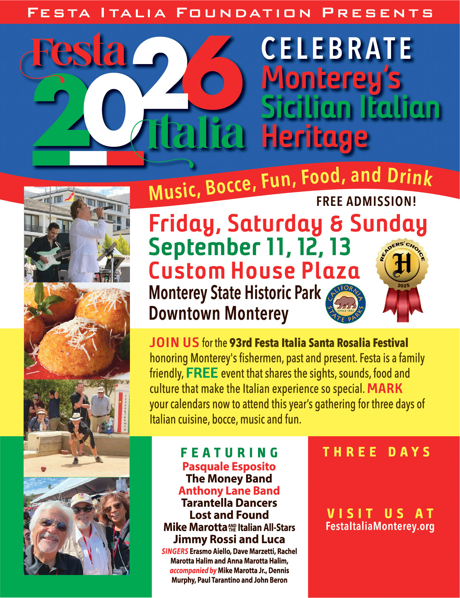 This beloved, 3-day free, family-friendly festival on September 11-13, 2026, offers fun for all ages with great food, live music, dancing, bocce tournament, shopping, networking and more. Drawing attendees from across the United States, Festa Italia remains one of Monterey’s most cherished cultural traditions, capturing the sights, sounds, flavors, and spirit of Italy in a welcoming community setting celebrated at 20 Custom House Plaza – Monterey State Historic Park in Downtown Monterey adjacent to Old Fisherman’s Wharf. Festa Italia is proud to be the First Place winner for “Best 2025 Community Event” in the annual Monterey Herald’s Readers' Choice Awards.